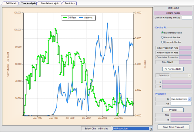 2. Examine the key production profile statistics for any Gulf of Mexico oil and gas field for analogue field comparison. Figures are calculated for peak offtake rate, cumulative offtake, decline curve parameters, associated hydrocarbon (gas or condensate) and non-hydrocarbon (water) development with time and versus cumulative hydrocarbon phase.