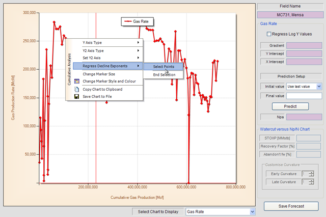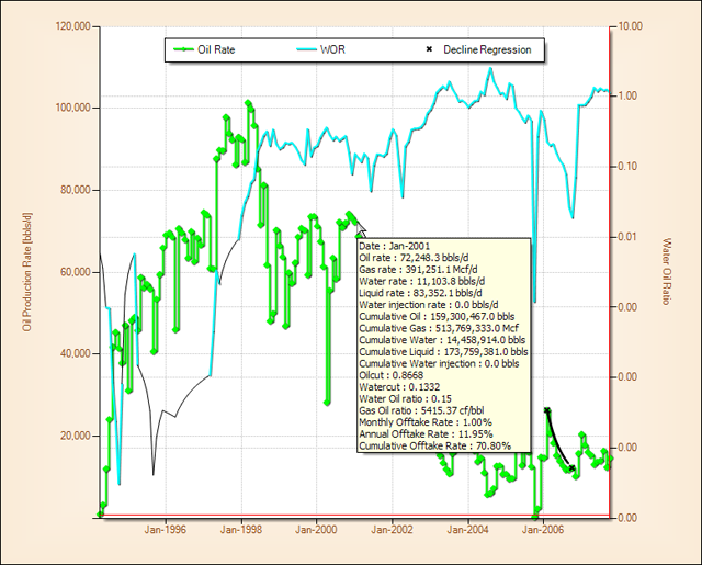 4. Perform field level decline curve analysis on the oil or gas rate v's time basis, or any rates and ratios displayed on a cumulative basis.