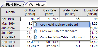 5. Export the field production histories of any field to any external package via copy and paste and the windows clipboard.